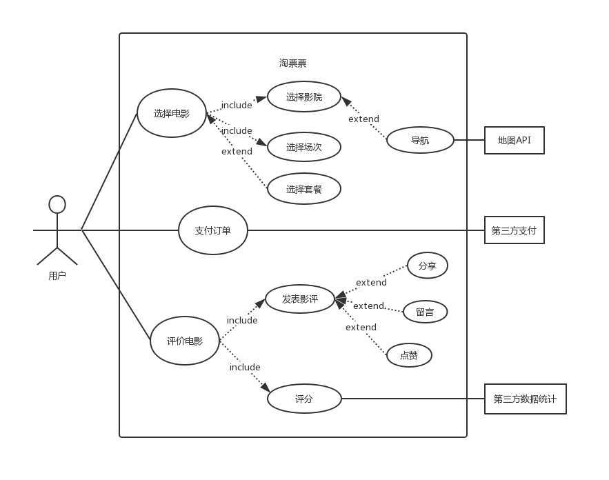 选择2-3个你熟悉的类似业务的在线服务系统,如定宾馆、定电影票、背单词App等,分别绘制它们的用例图,并满足一下要求: