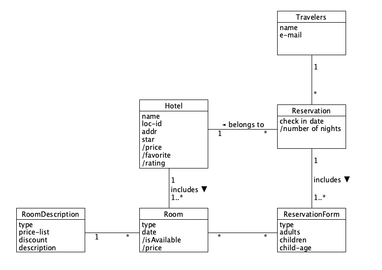 Reservation (ID/PrimeryKey, TravelerID/ForeignKey, HotelID/ForeignKey, Date, Time, CheckInDate, CheckOutDate, AdultNum, ChildNum, ChildAge)